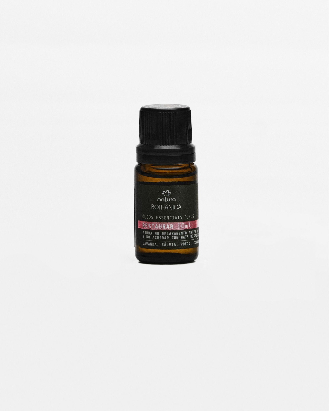 *Natura Bothânica Restaurar* - Auxilia no relaxamento antes de dormir e estimula a disposição ao acordar no dia seguinte. Sua fórmula contém blend de óleos essenciais de lavanda, sálvia, além dos óleos essenciais proprietários de Natura como poejo, copaíba e breu Branco