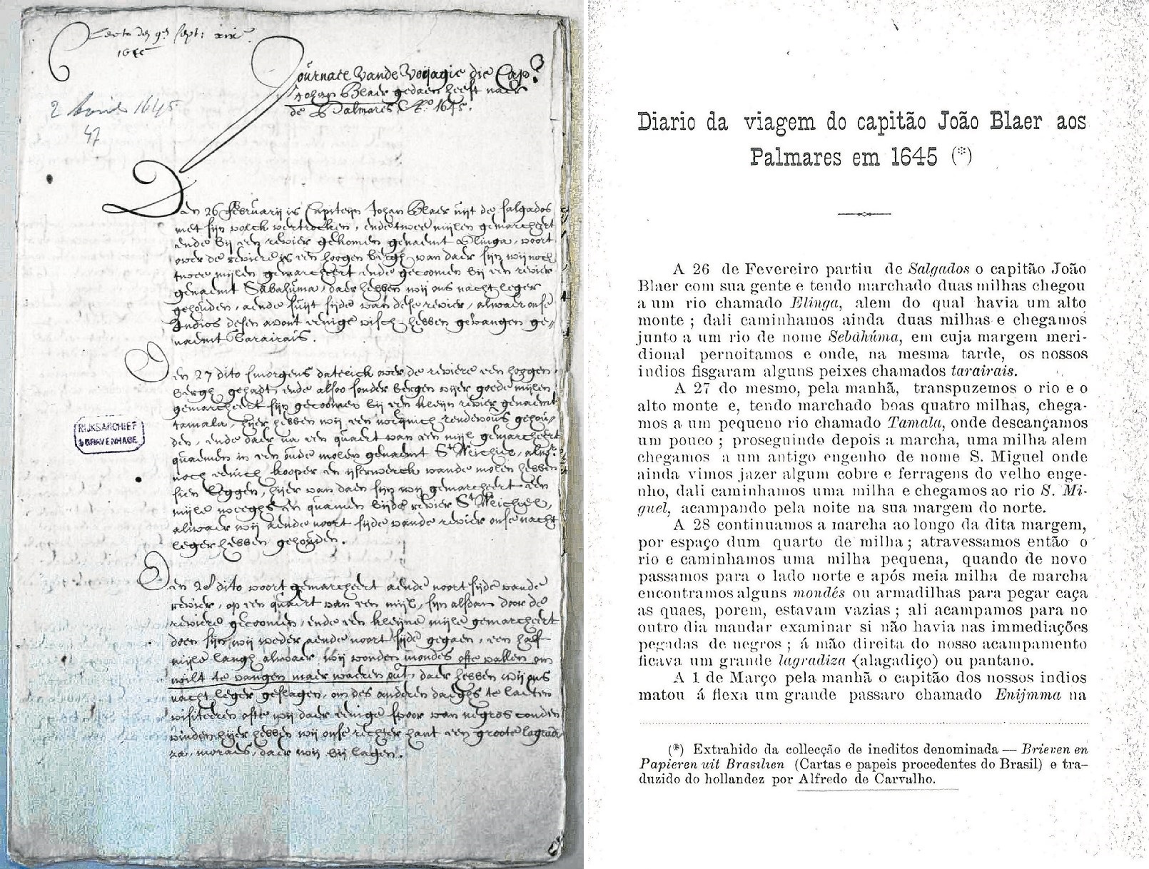Um dos pontos altos do livro é a referência ao “Diário do Capitão Blaer”, escrito em 1645 pelo oficial holandês Johan Blaer, cuja expedição rumo a Palmares passou justamente por Osenga. No diário, atualmente arquivado no Museu do Louvre, em Paris, Blaer relata a queima de casas de taipa e os embates com os quilombolas da região.