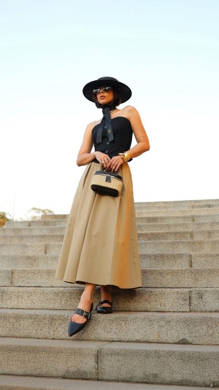 *Saias midi* - Elegantes e funcionais, as saias midi seguem como aposta certeira para composições práticas e sofisticadas. O comprimento intermediário favorece a mobilidade e permite múltiplas combinações, transitando do casual ao refinado com facilidade. Em tecidos fluidos ou mais encorpados, elas reforçam a ideia de peças-chave e se mantêm relevantes ao longo das temporadas.