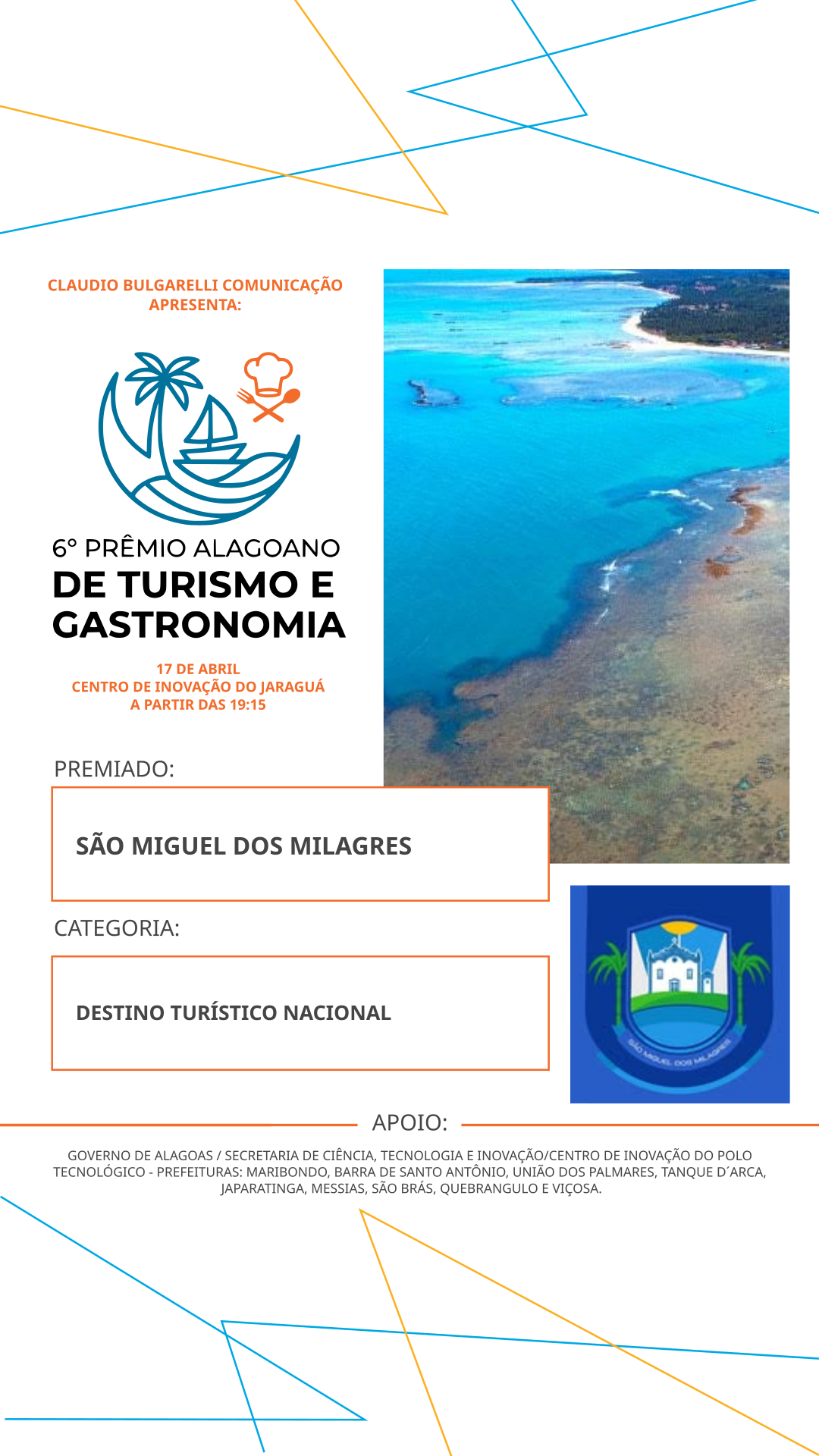 SÃO MIGUEL DOS MILAGRES SERÁ PREMIADO NO 6o PRÊMIO ALAGOANO DE TURISMO COMO DESTINO TURÍSTICO BRASILEIRO