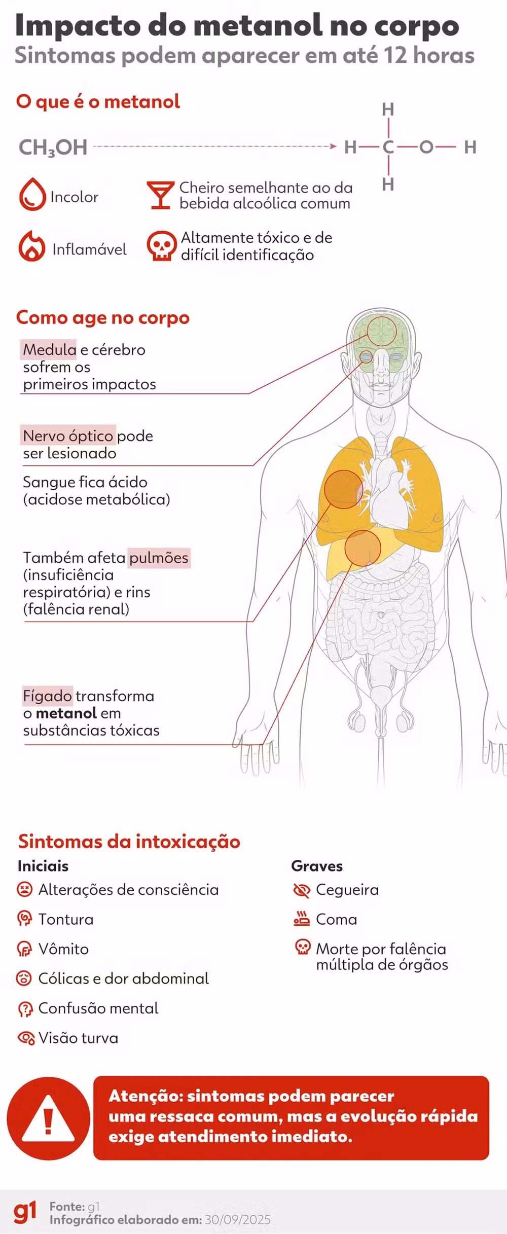 Usado industrialmente em solventes e outros produtos químicos, o metanol é um álcool altamente perigoso quando ingerido. Inicialmente, ataca o fígado, que o transforma em substâncias tóxicas que comprometem a medula, o cérebro e o nervo óptico, podendo causar cegueira, coma e até morte. Também pode provocar insuficiência pulmonar e renal.