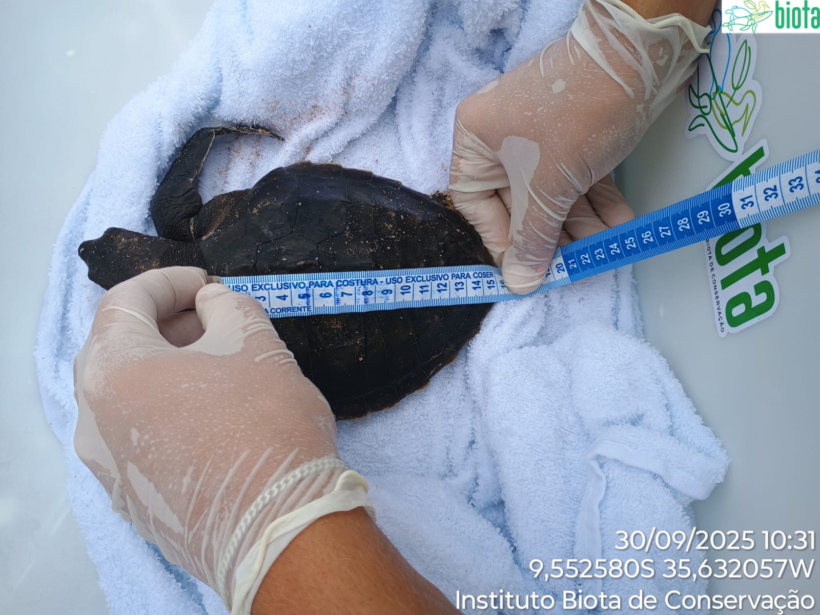 O animal, uma tartaruga-oliva ainda filhote, mede cerca de 15 centímetros e foi encontrado por populares com as duas nadadeiras estranguladas pelo material. Uma das nadadeiras já apresentava corte profundo até o osso, com possível necessidade de amputação.