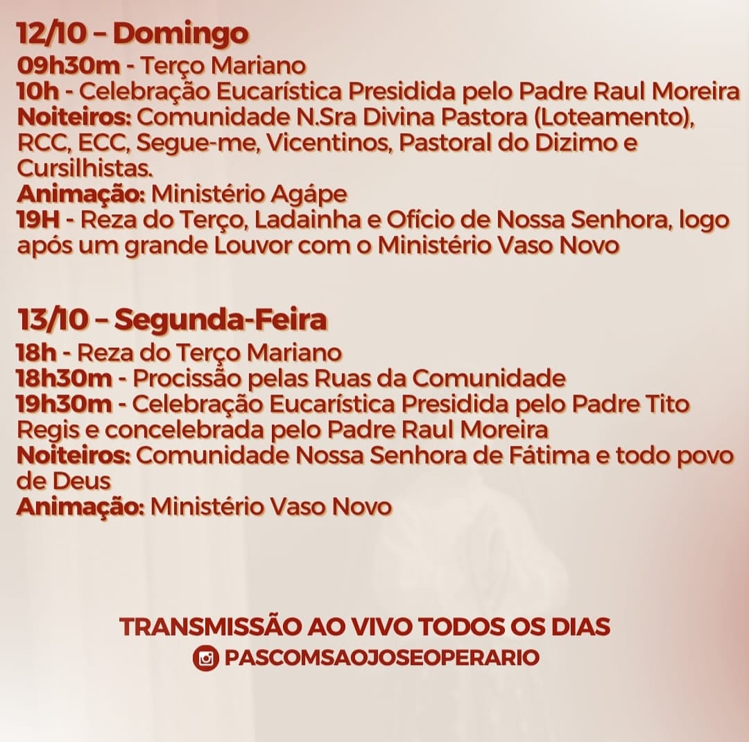 A programação da festa segue até a próxima segunda-feira (13). E será transmitida pelas redes sociais da Paróquia de São José Operário.