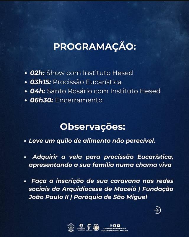 Após a celebração, o público participa do show com o Ministério Tronos (23h45) e da pregação com o Instituto Hesed (1h). A madrugada segue com momentos de fé e adoração: show com o Instituto Hesed (2h), procissão eucarística (3h15), Santo Rosário (4h) e encerramento às 6h30.