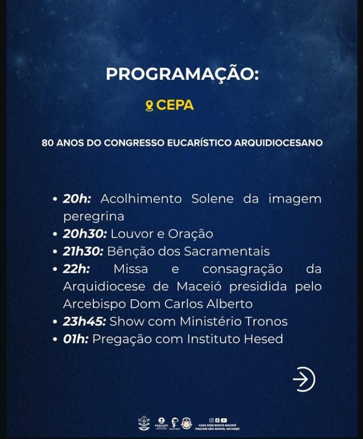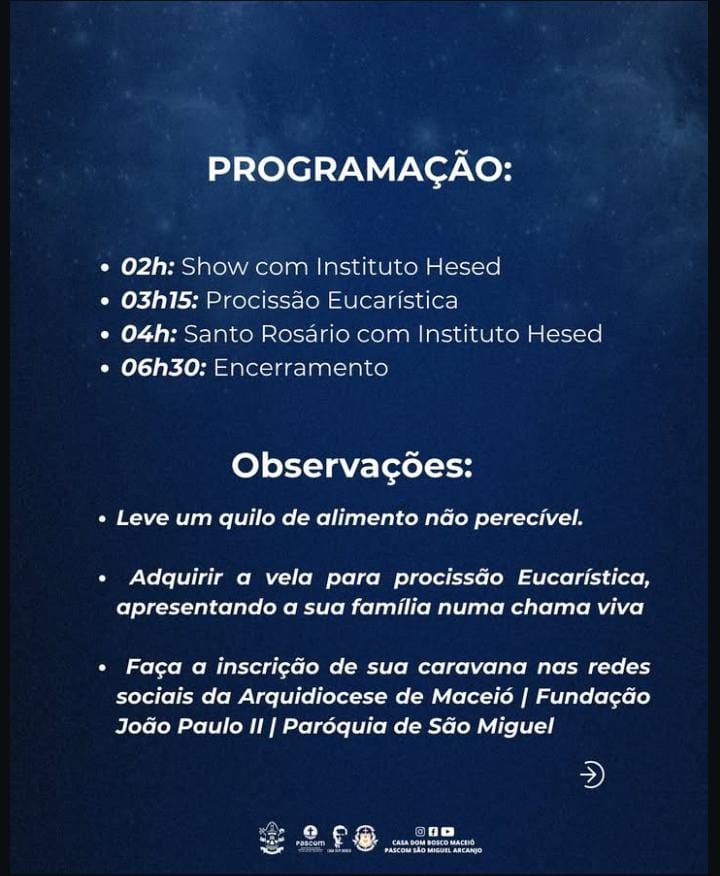 Com expectativa de público de cerca de 25 mil pessoas, o evento teve início com a peregrinação da imagem, que passou por Marechal Deodoro no sábado e retornou à capital para uma carreata até a Matriz de São Miguel Arcanjo. Além da Missa de Consagração, a programação incluiu palestras, momentos de adoração e oração, consolidando a vigília como um verdadeiro retiro coletivo de fé para toda a comunidade católica de Alagoas.