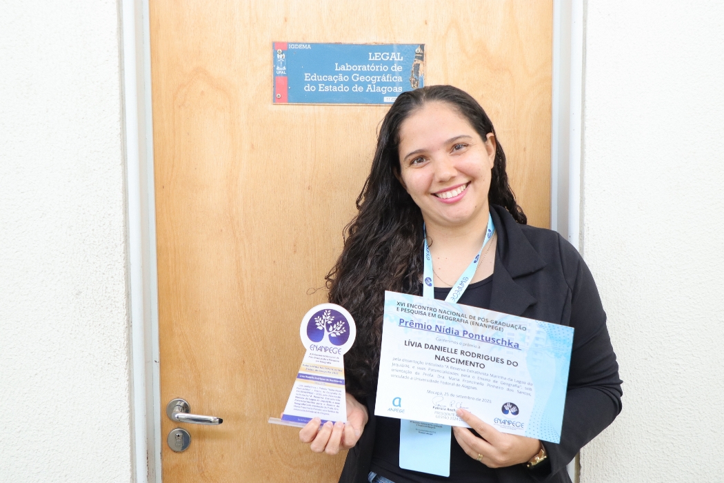 Ficou para a egressa do mestrado e doutoranda do Instituto de Geografia e Meio Ambiente (Igdema) da Universidade Federal de Alagoas (Ufal), Lívia Danielle Rodrigues do Nascimento, o referenciado Prêmio Nídia Nacib Pontuschka, que não só destaca a instituição alagoana no cenário nacional, mas também o Nordeste: é a primeira vez que a região recebe o prêmio em uma dissertação no campo do Ensino em Geografia.