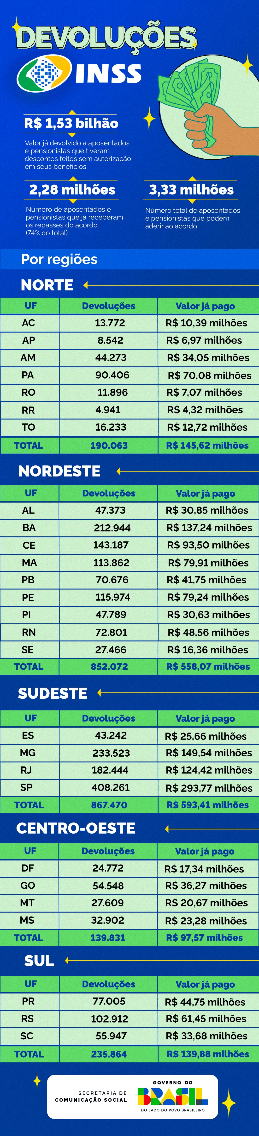 Em todo o país, o Governo do Brasil já garantiu a devolução de R$ 1,53 bilhão a aposentados e pensionistas que foram prejudicados. Um total de 2,46 milhões de beneficiários aderiram ao acordo de ressarcimento e já receberam os valores devidos, o que representa 74% dos 3,33 milhões de brasileiros que estão aptos a receber.