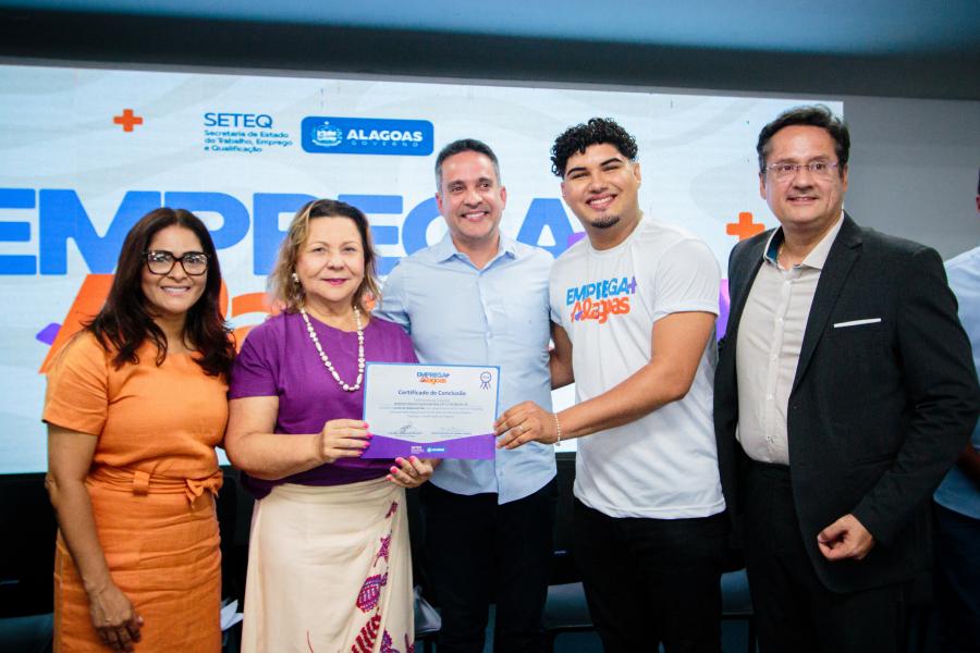 O governador Paulo Dantas entregou, nesta quarta-feira (22), 120 certificados do programa Emprega Mais Alagoas, durante solenidade no Auditório Aqualtune, no Palácio República dos Palmares. O evento celebrou também as 3 mil certificações concedidas desde o início do programa.