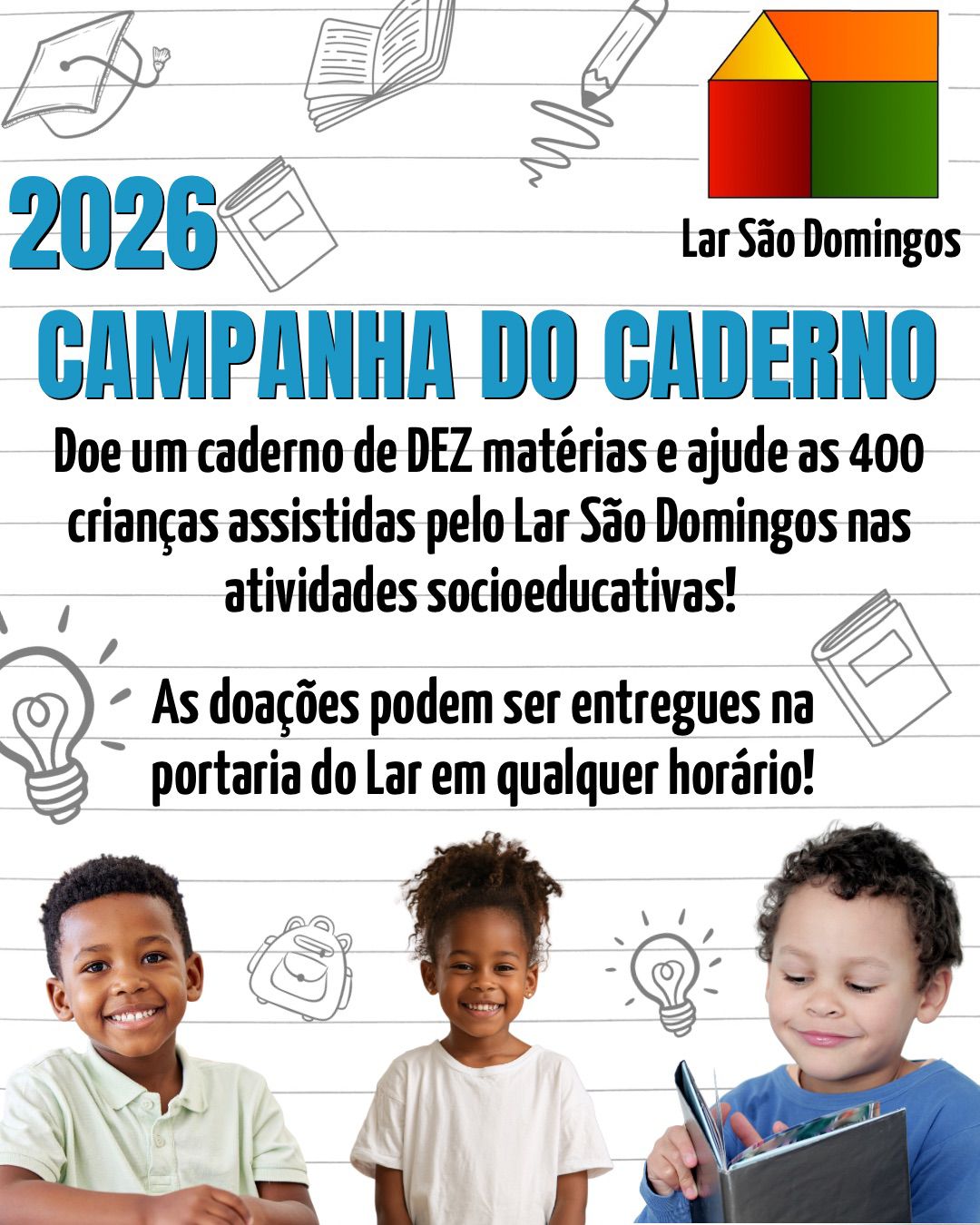 O Lar São Domingos iniciou uma campanha de arrecadação de cadernos para atender crianças assistidas pela instituição no início do ano letivo de 2026. A ação tem como objetivo garantir material escolar para as atividades socioeducativas desenvolvidas ao longo do ano.
