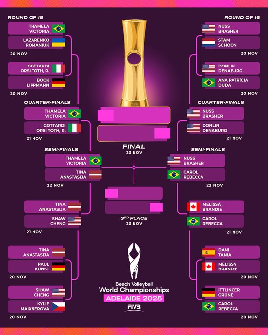Thamela e Vic voltam a entrar em ação no próximo sábado (22), a partir das 2h30 (horário de Brasília), para medirem forças com as representantes da Letônia, Tina Graudina e Anastasija Samoilova. Depois, a partir das 6h30, será a vez de Carol e Rebecca jogarem com as nortes-americanas Kristen Nuss e Taryn Brasher.´