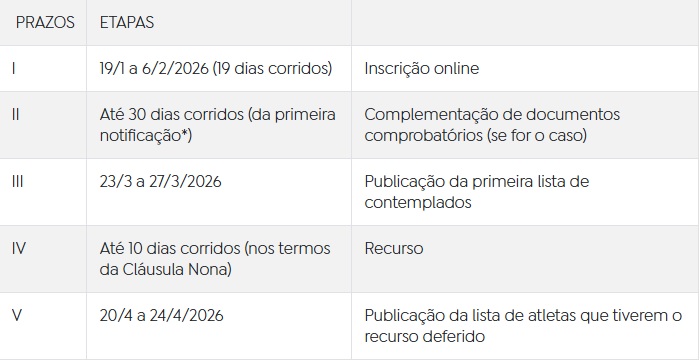 Confira abaixo o cronograma do edital para o Bolsa Atleta 2026.