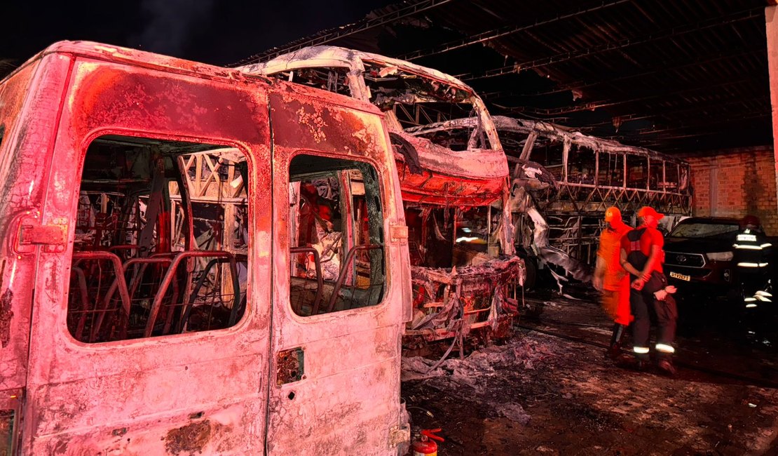 A garagem fica localizada próximo de um posto de combustíveis e dois ônibus e duas vans ficaram totalmente carbonizados.