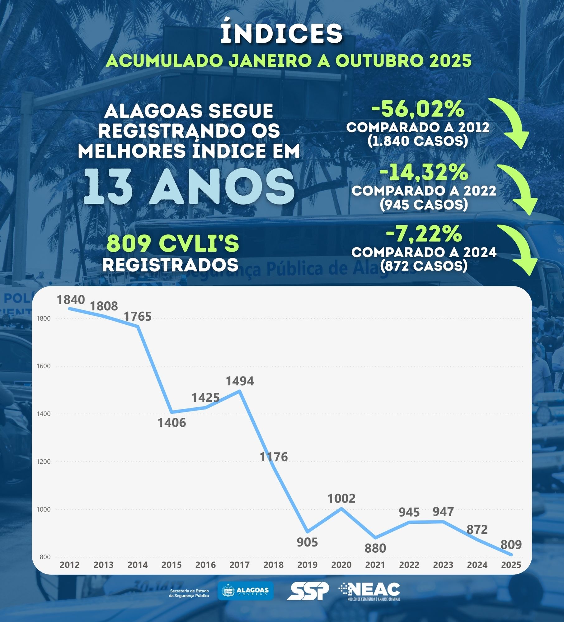 A Secretaria de Estado da Segurança Pública de Alagoas (SSP/AL) segue apresentando os melhores índices de segurança desde 2012. O Estado alcança, em 2025, o melhor desempenho em 13 anos, em meio a uma trajetória de redução consistente da criminalidade e à expectativa de encerrar o ano com menos de mil Crimes Violentos Letais Intencionais (CVLIs).