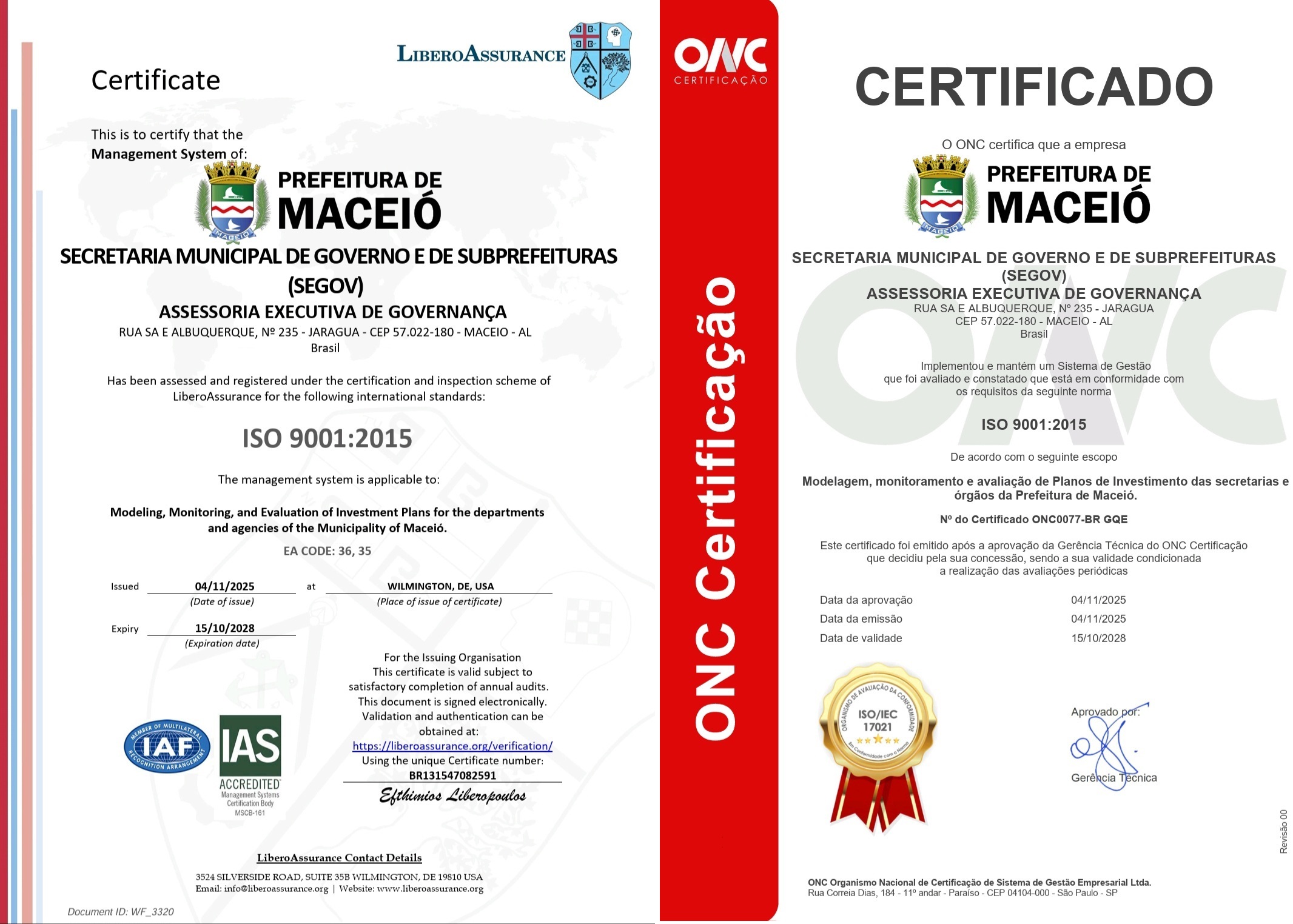O escopo da certificação abrange a modelagem, o monitoramento e a avaliação dos Planos de Investimento das secretarias e órgãos da Prefeitura de Maceió, que é um trabalho estratégico que garante maior eficiência, transparência e padronização das ações de governo.