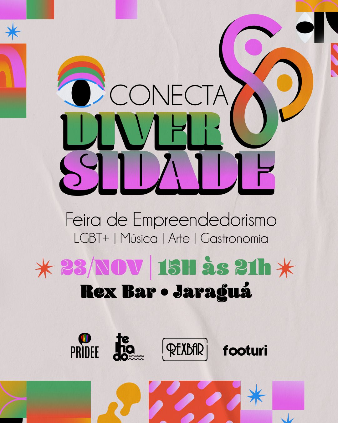 A Conecta Diversidade tem o apoio do Rex Bar, Telhado Comunicação e Marketing e Footuri — Feira de Empreendedorismo Criativo e Inclusivo de Alagoas.