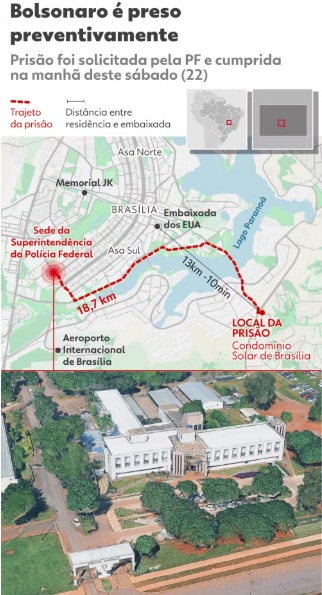 Bolsonaro foi levado diretamente para a Superintendência da Polícia Federal, em Brasília. Em nota oficial, a Polícia Federal informou que cumpriu um mandado de prisão preventiva por decisão do STF.