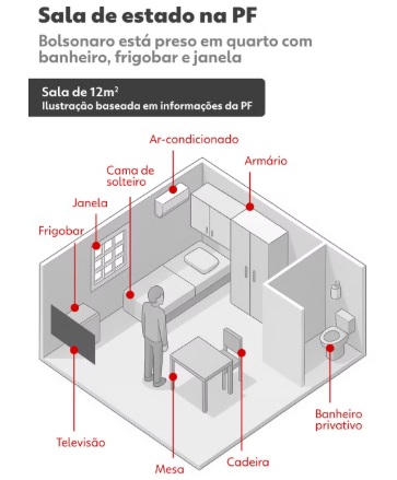 O presidente Luiz Inácio Lula da Silva e o ex-presidente Michel Temer, quando detidos, também ficaram em salas de Estado da Polícia Federal – em Curitiba (PR) e São Paulo, respectivamente.