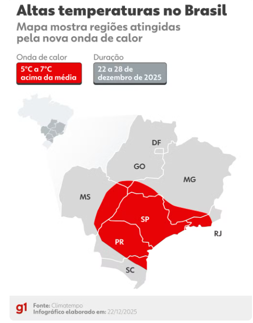 Nessas regiões, as temperaturas continuam vários graus acima da média para dezembro, o que configura uma onda de calor.