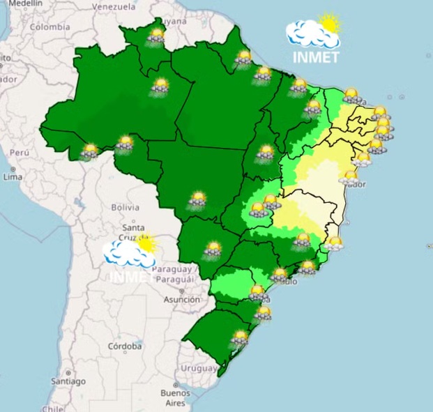 A chuva aparece de forma pontual, concentrada principalmente no fim da tarde, mas sem alcance suficiente para aliviar o calor de forma duradoura.