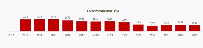No ano passado, a população residente foi de 212,7 milhões de pessoas, aumento de 0,39% em relação a 2024. A taxa de crescimento tem ficado abaixo de 0,60% desde 2021. Do total, 51,2% eram mulheres e 48,8% eram homens.