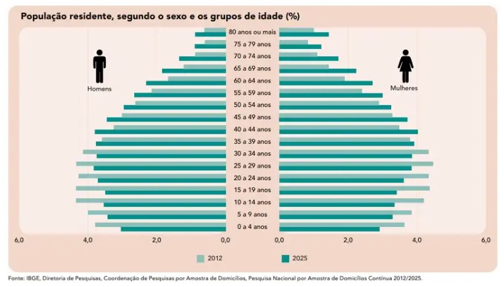 A distribuição da população residente no país mostra queda da proporção de pessoas abaixo de 40 anos de idade: o grupo está 6,1% menor em 2025 do que em 2012. Por outro lado, há crescimento dos que estão acima dessa faixa etária: 40 a 49 anos (de 13% para 15%), 50 a 59 anos (de 10% para 11,8%) e 60 anos ou mais (de 11,3% para 16,6%).