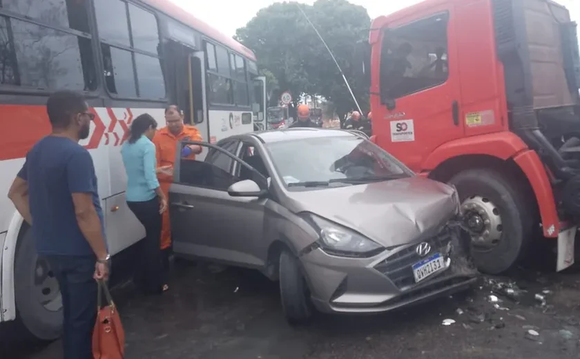 Nesta sexta-feira (14), uma mulher ficou ferida e presa às ferragens, em um acidente envolvendo um caminhão, um ônibus coletivo e carro de passeio, na Avenida Durval de Góes Monteiro, no bairro Tabuleiro do Martins, parte alta de Maceió.