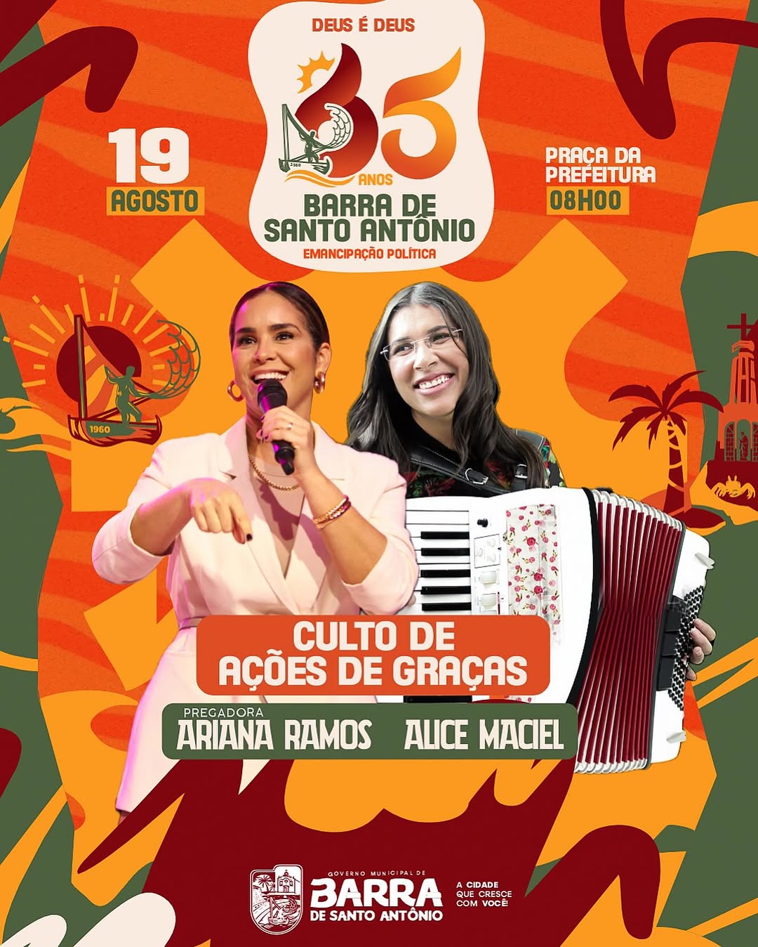 Como forma de abrir esse ciclo de celebrações, o dia 19 de agosto será dedicado à fé e à espiritualidade que tanto sustentam nossa gente. Um Culto de Ações de Graças tomará conta da Praça da Prefeitura, com louvores, pregações e a presença de nomes respeitados como a pregadora Ariana Ramos e a cantora Alice Maciel. Um momento de comunhão que convida a cidade a agradecer pelas vitórias e renovar a esperança nos dias que virão.