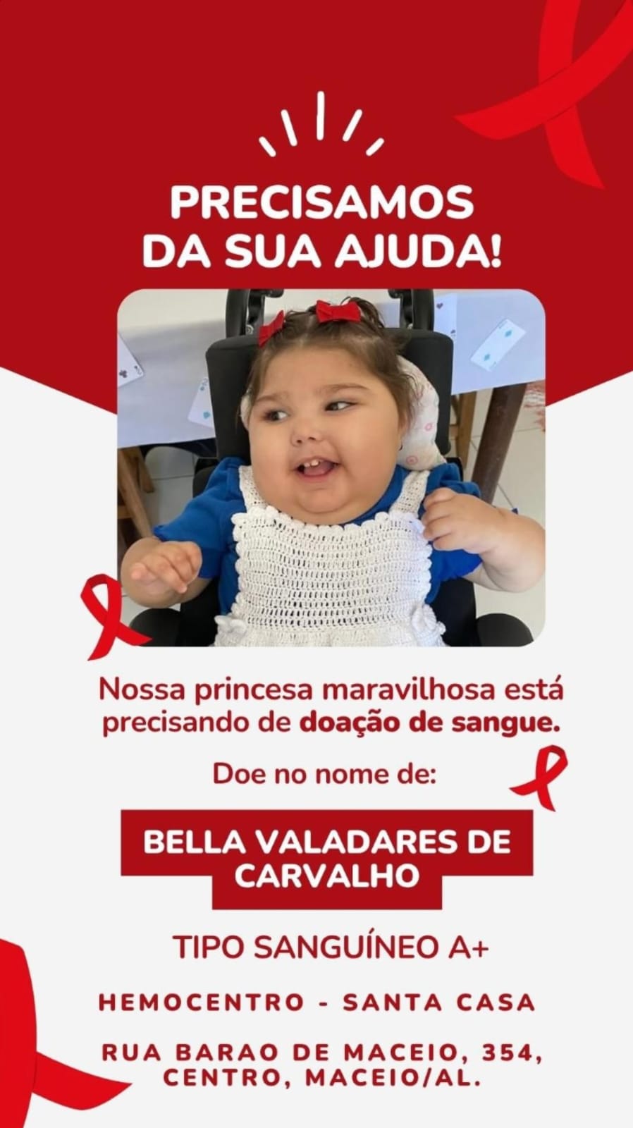 Bella enfrenta um quadro de anemia e depende de transfusões para seu tratamento. As doações podem ser realizadas no Hemocentro da Santa Casa de Misericórdia de Maceió, localizado na Rua Barão de Maceió, nº 288, no Centro da capital alagoana. O funcionamento ocorre às segundas, quartas e sextas-feiras das 7h às 16h, e às terças e quintas-feiras das 7h às 15h.