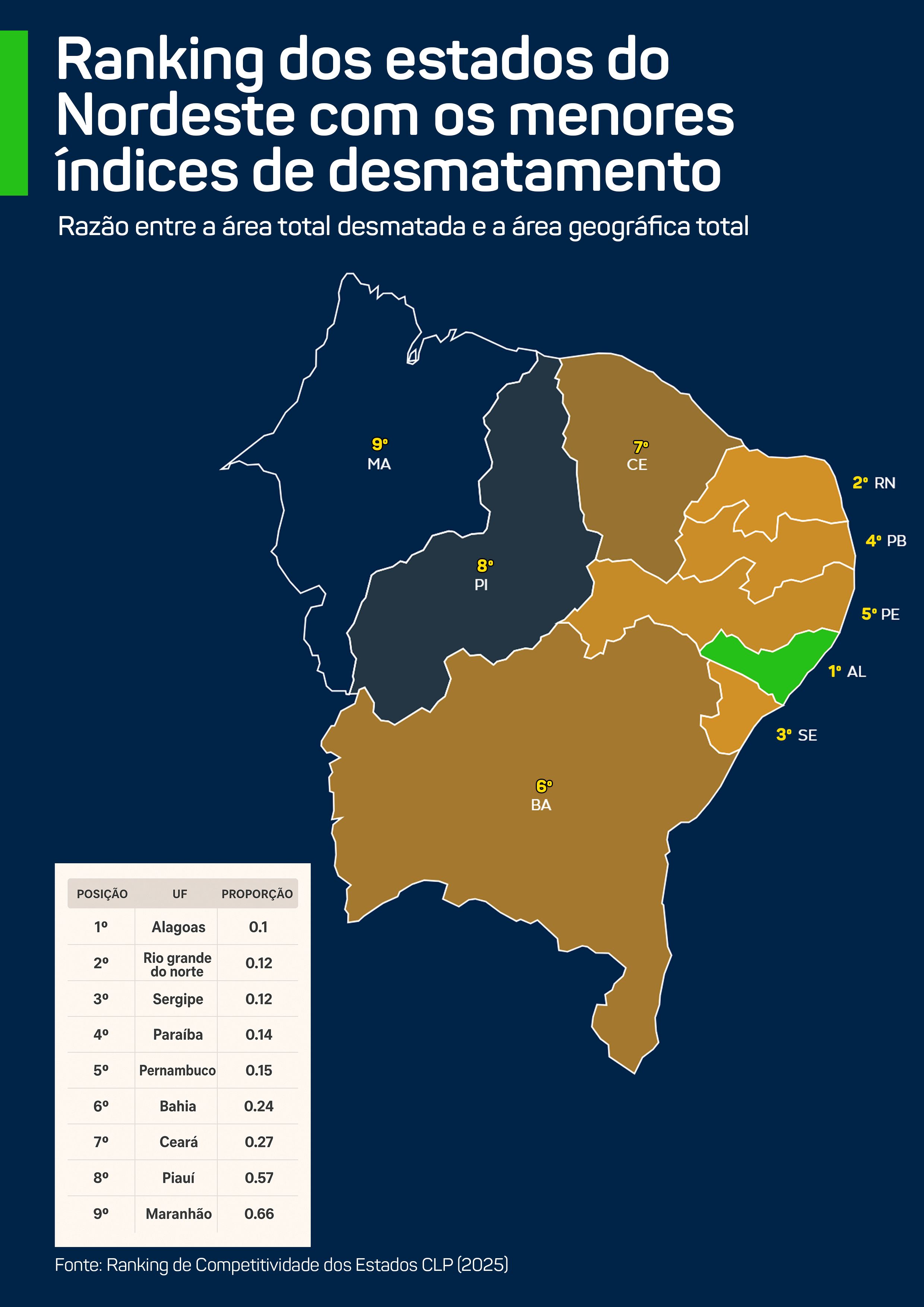 Segundo o CLP, o indicador considera a razão entre a área total desmatada e a área geográfica total de cada unidade da federação, permitindo avaliar proporcionalmente o impacto do desmatamento em cada território. Em Alagoas, este impacto tem a proporção de 0.1. O estudo tem como fontes o MapBiomas e o Instituto Brasileiro de Geografia e Estatística (IBGE).