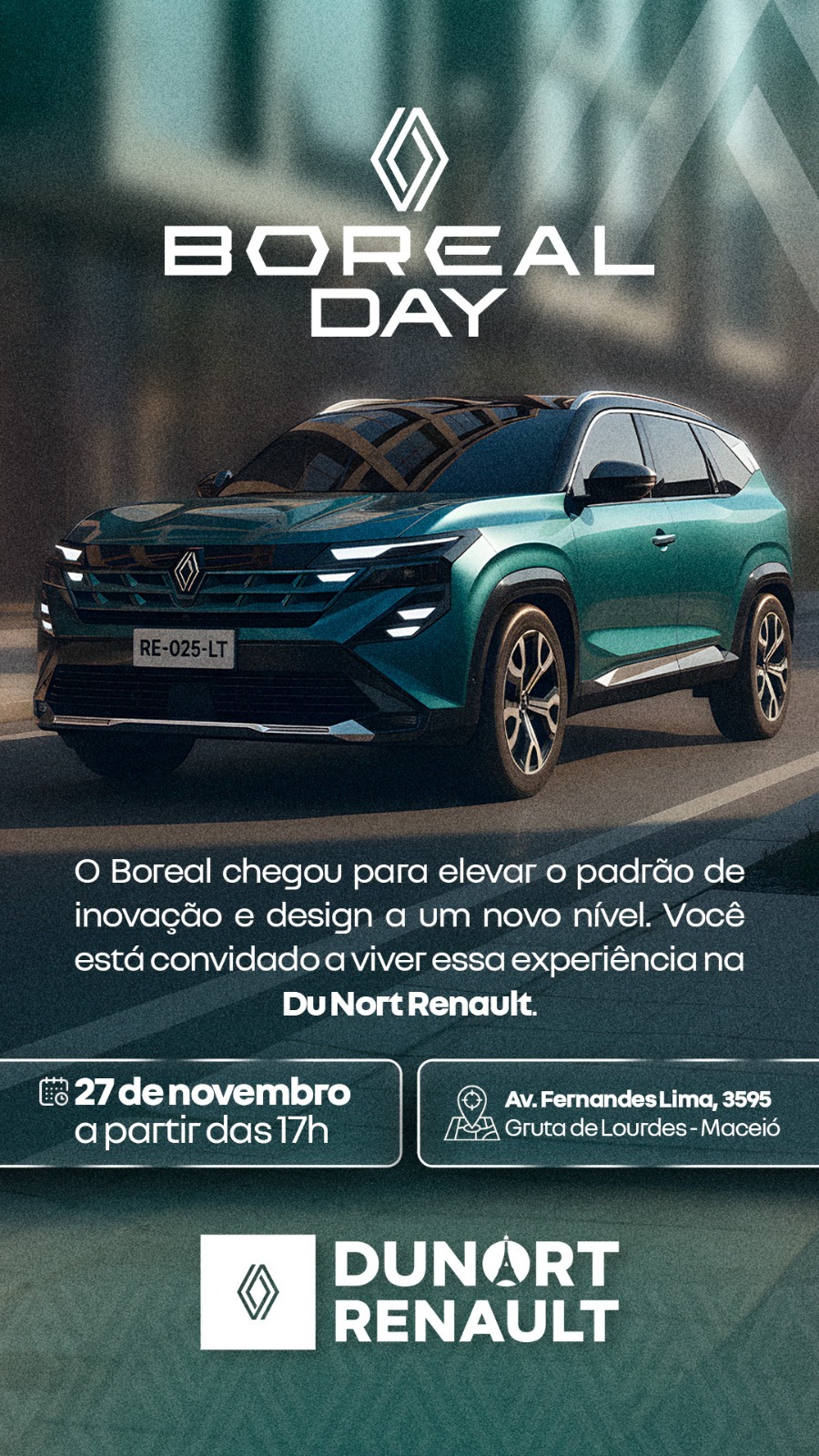 A Du Nort Renault realiza nesta quinta-feira (27), a partir das 17h, o Boreal Day, evento exclusivo de lançamento oficial do Renault Boreal, em Maceió. O encontro apresentará à imprensa, clientes e parceiros o novo SUV da marca, que chega ao mercado com um pacote robusto de tecnologia, design sofisticado e experiência de direção aprimorada.