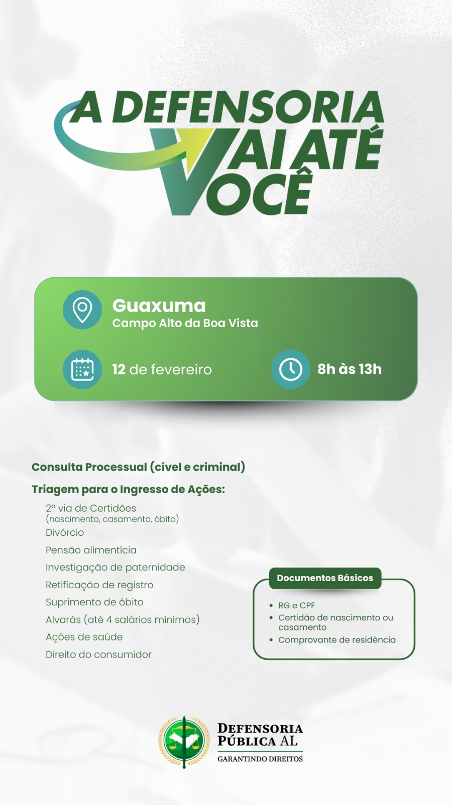 O programa A Defensoria Vai Até Você leva os serviços da Defensoria Pública do Estado de Alagoas (DPE/AL) aos moradores de Guaxuma nesta semana. A ação será realizada na quinta-feira (12), das 8h às 13h, no Campo Alto da Boa Vista.