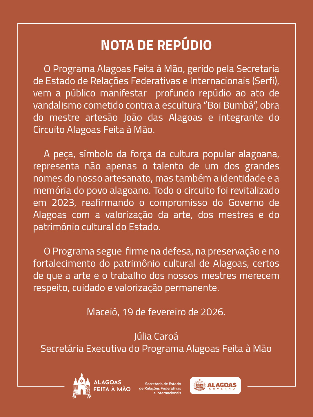 O Programa Alagoas Feita à Mão, vinculado à Secretaria de Estado de Relações Federativas e Internacionais (Serfi), manifestou repúdio ao ato de vandalismo cometido contra a escultura “Boi Bumbá”, do mestre artesão João das Alagoas, integrante do Circuito Alagoas Feita à Mão, iniciativa de valorização dos mestres artesãos e de promoção do patrimônio cultural alagoano. A obra, instalada na Avenida da Paz, no bairro do Jaraguá, é um dos símbolos da cultura popular alagoana e integra o conjunto de obras que fortalecem a identidade cultural do estado.