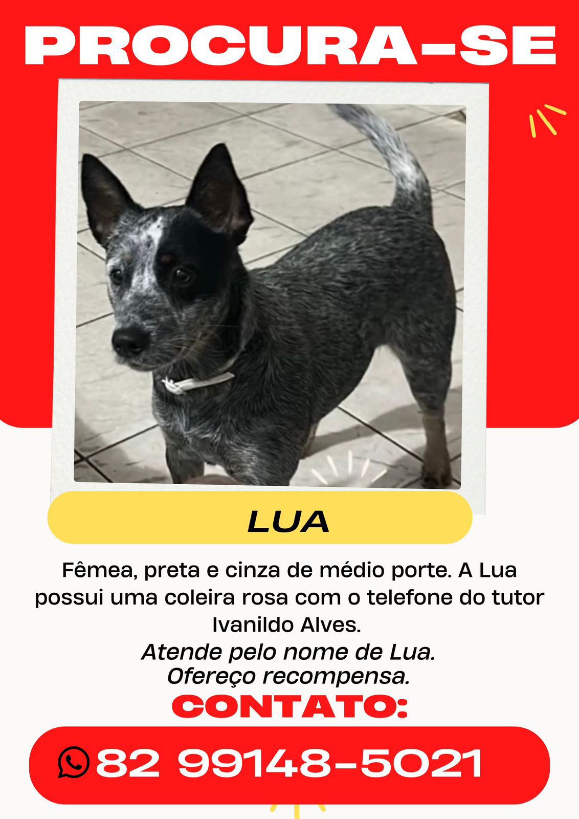 Uma cadela chamada Lua desapareceu na última quinta-feira (26), por volta das 18h, após se soltar da coleira durante um passeio na rua da Arena Ouro Preto, em Maceió. O animal, uma fêmea de aproximadamente 1 ano e 2 meses, é da raça boiadeiro australiano e desde então não foi mais visto, mobilizando familiares e moradores da região em buscas.