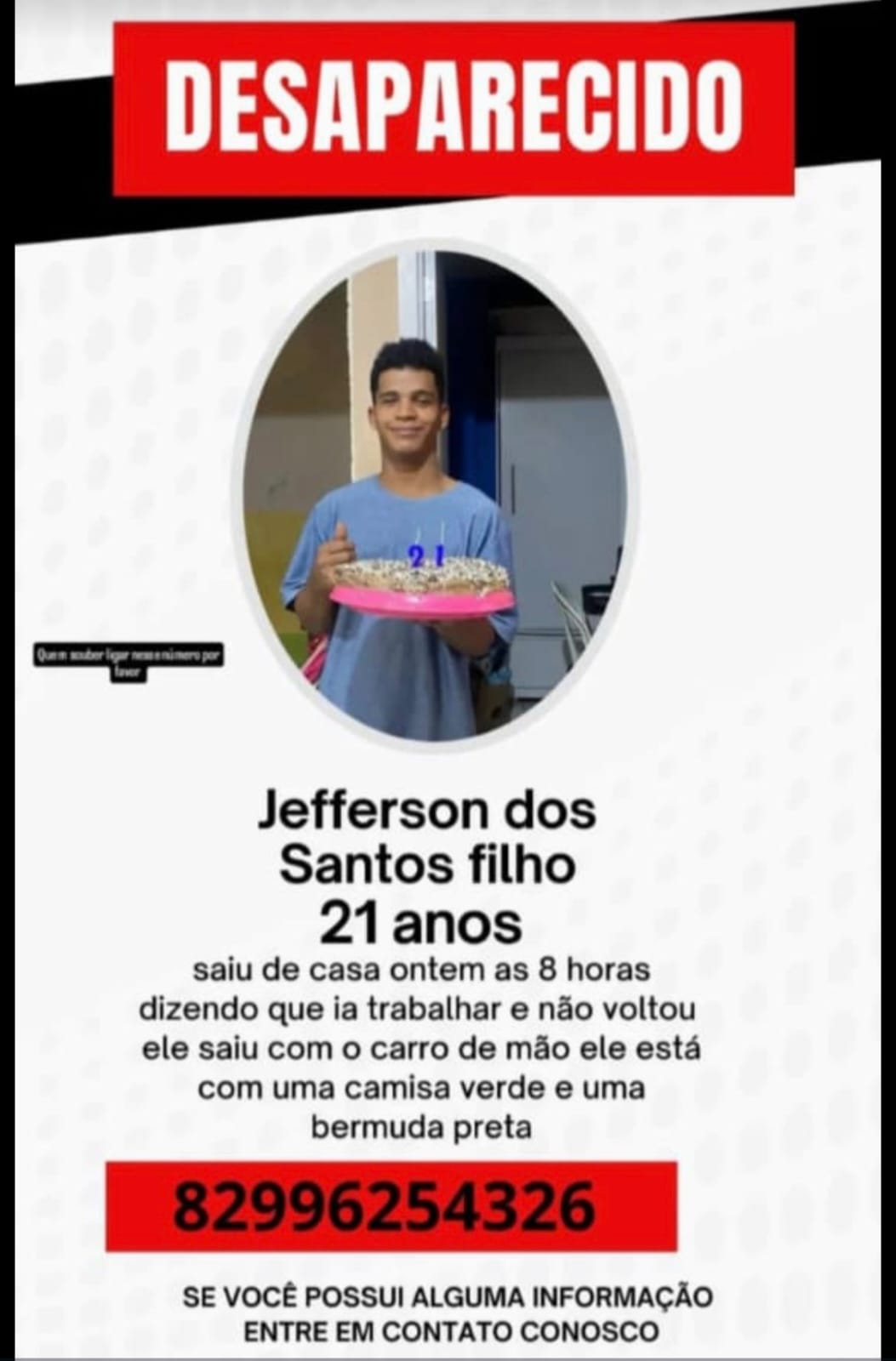 No momento em que foi visto pela última vez, o jovem vestia camisa verde e bermuda preta. Ele também estava com um carro de mão.
