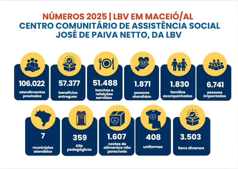 Destacam-se, os atendimentos técnicos — nas áreas social, psicológica, pedagógica e psicossocial, entre outras — fundamentais para o acompanhamento contínuo dos atendidos e de suas famílias, fortalecendo vínculos e promovendo o desenvolvimento integral. Entre os benefícios entregues, foram 57.664 cestas de alimentos não perecíveis, 29.603 cestas verdes (frutas, legumes e verduras) e 14.355 cobertores. Também foram entregues 45.596 kits pedagógicos e lúdicos e uniformes, que contribuem para a permanência e o bom desempenho dos mais de 13 mil crianças, adolescentes e jovens atendidos nos serviços e programas dos Centros Comunitários de Assistência Social e nas escolas da LBV. Para as pessoas idosas, a Instituição realizou 1.209.360 atendimentos e benefícios.