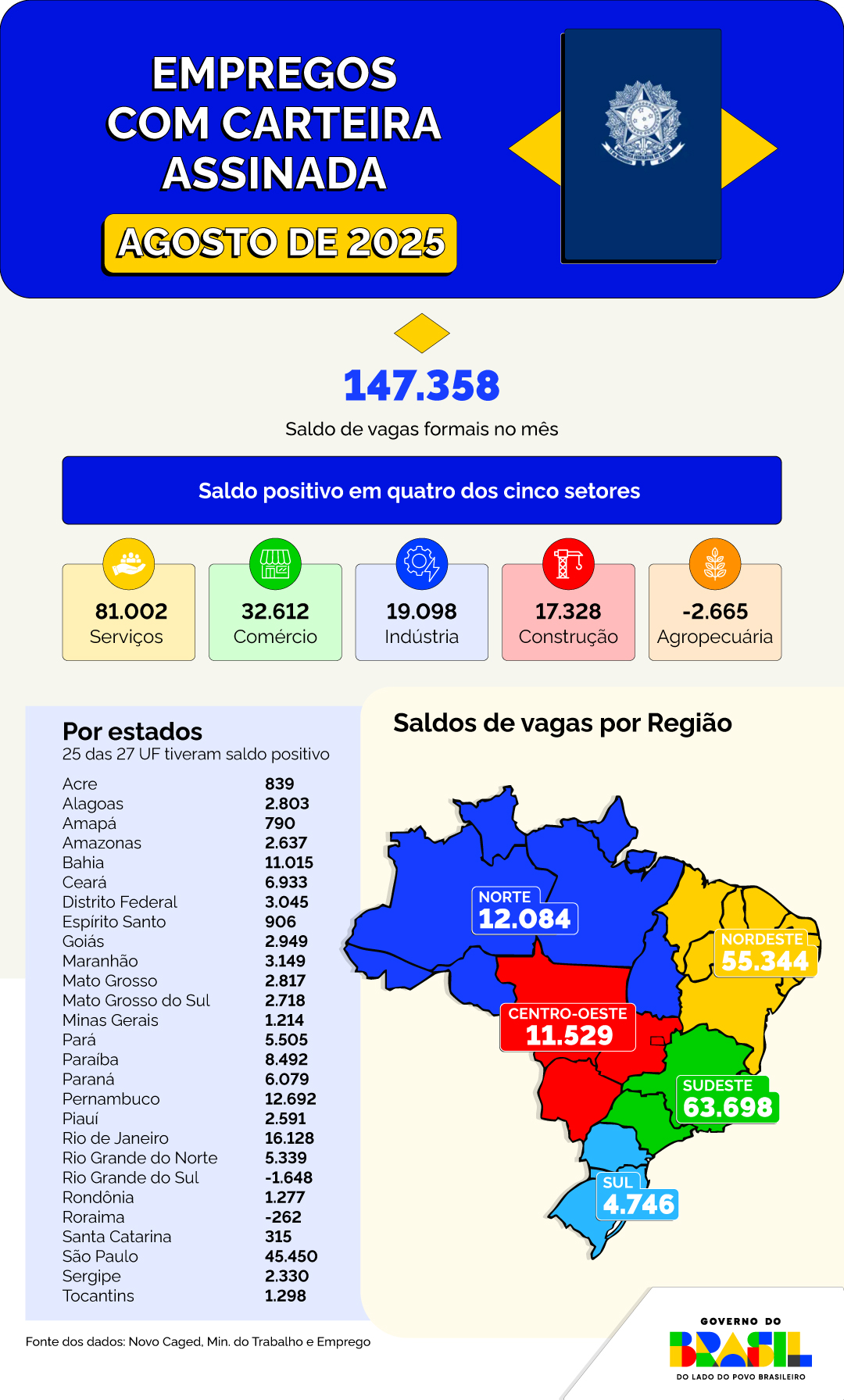 Levando em conta apenas o mês de agosto, 147.358 novos postos formais de trabalho foram abertos no Brasil, saldo de 2.239.895 admissões e 2.092.537 desligamentos. Foram registrados saldos positivos em 25 das 27 Unidades da Federação. Os destaques em números absolutos ficaram com São Paulo (45.450), Rio de Janeiro (16.128) e Pernambuco (12.692). Em termos relativos, Paraíba (+1,61%), Rio Grande do Norte (+0,98%) e Pernambuco (+0,82%) tiveram protagonismo.