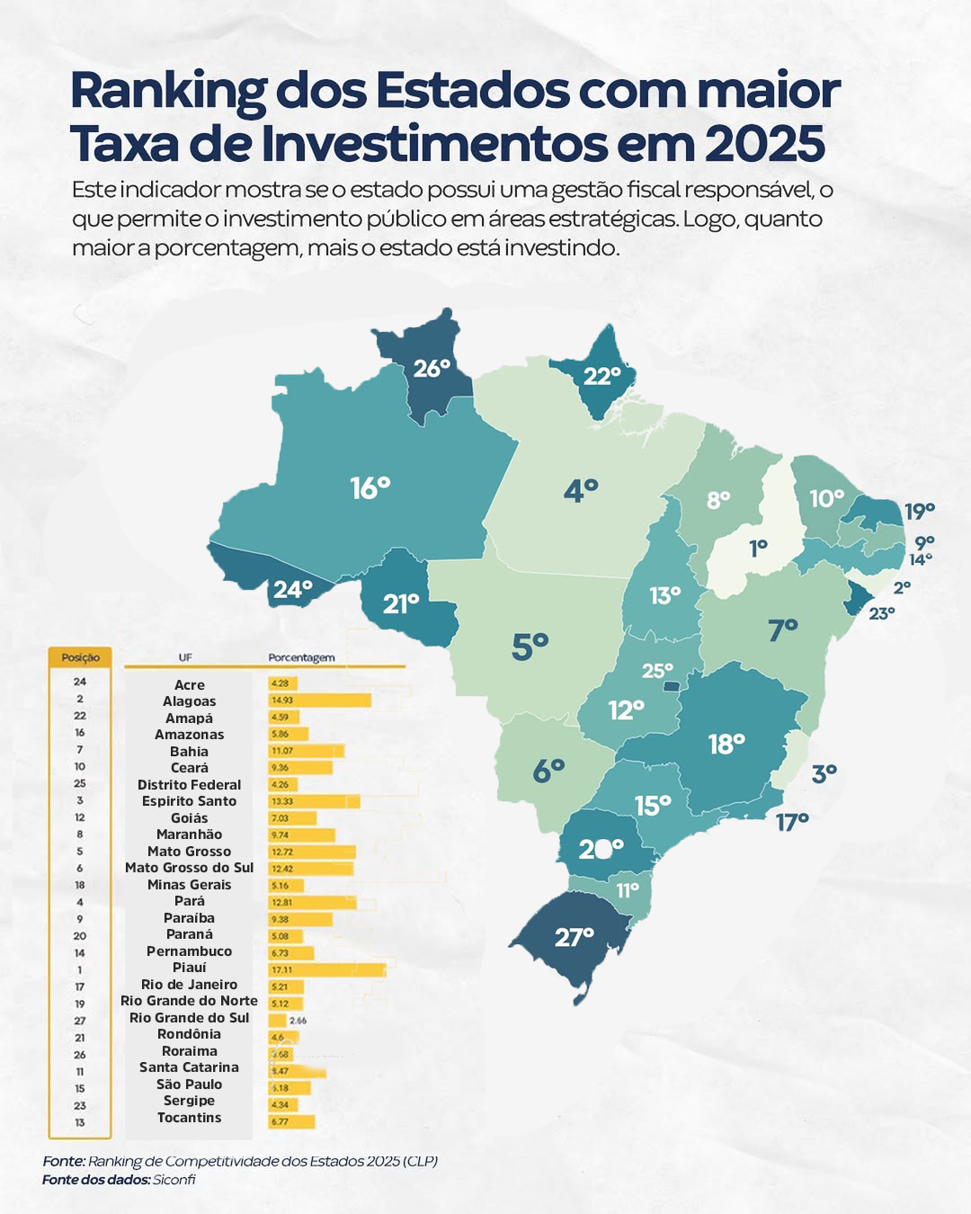 De acordo com a instituição, o indicador mostra se o estado possui uma gestão fiscal responsável, o que permite o investimento público em áreas estratégicas. Logo, explica o CLP, quanto maior a porcentagem, mais o estado está investindo.
