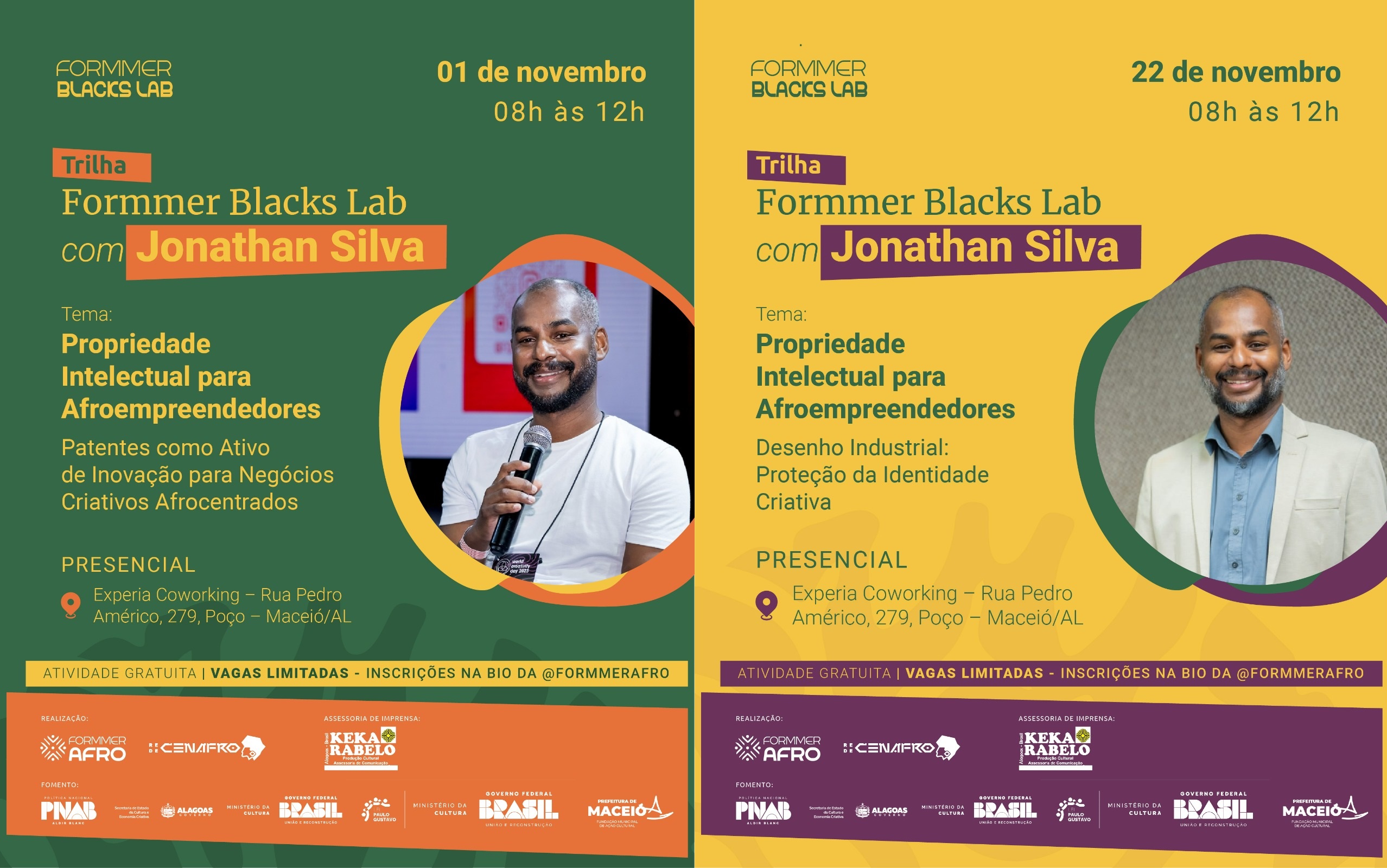 As formações presenciais acontecem em novembro, no Experia Coworking, em Maceió/AL, conduzidas por Jonathan Silva — administrador, doutorando em Ciência da Propriedade Intelectual (PPGPI/UFS), mestre em Propriedade Intelectual e Transferência de Tecnologia para Inovação (PROFNIT/UFAL) e especialista em Gestão Estratégica de Negócios e Mercado (USP). Atualmente, Jonathan também é mestrando em Administração e Controladoria com ênfase em Gestão Cultural (PPAC/UFC).