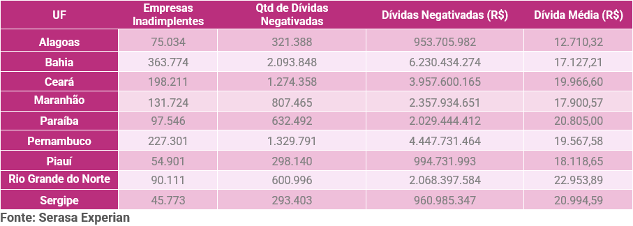 De acordo com o Indicador de Inadimplência das Empresas da Serasa Experian, primeira e maior datatech do país, o Nordeste somou 1.284.375 empresas inadimplentes em setembro de 2024. A análise revelou que a Bahia liderou o ranking regional com 363.774 negócios com contas em atraso, seguida por Pernambuco (227.301) e Ceará (198.211). Na outra ponta, os menores volumes foram registrados em Sergipe (45.773), Piauí (54.901) e Alagoas (75.034). O estado com a maior dívida média por empresa foi o Rio Grande do Norte, chegando a quase R$23 mil reais por débito.