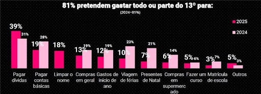 De acordo com o levantamento, 81% dos trabalhadores pretendem usar o valor integral ou parcial do 13º salário. Destes, 39% têm como principal objetivo quitar dívidas, um aumento de oito pontos percentuais em relação ao ano passado. Já 19% desejam pagar contas básicas e 18% devem limpar o nome.