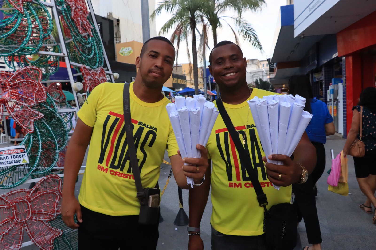 E quem vai ao Centro, entre uma compra e outra ainda pode fazer um lanchinho rápido ao comprar amendoins vendidos a R$ 6,00 a unidade. Tentando ajudar a campanha “Salva Vida em Cristo”, a dupla de amigos vende o petisco e ainda espalhas mensagens de fé e esperança.