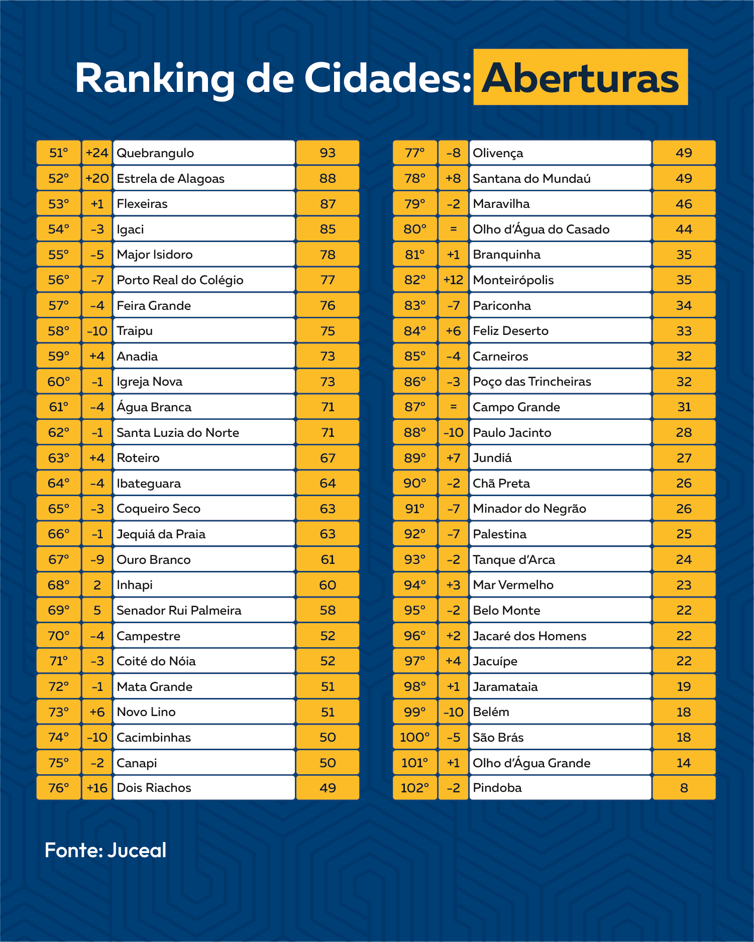 Por outro lado, as cidades com menos aberturas empresariais foram Pindoba (8), Olho d’Água Grande (14), Belém (18), São Brás (18), Jaramataia (19), Belo Monte (22), Jacaré dos Homens (22), Jacuípe (22), Mar Vermelho (23), Tanque d'Arca (24), Palestina (25), Chã Preta (26), Minador do Negrão (26), Jundiá (27) e Paulo Jacinto (28).