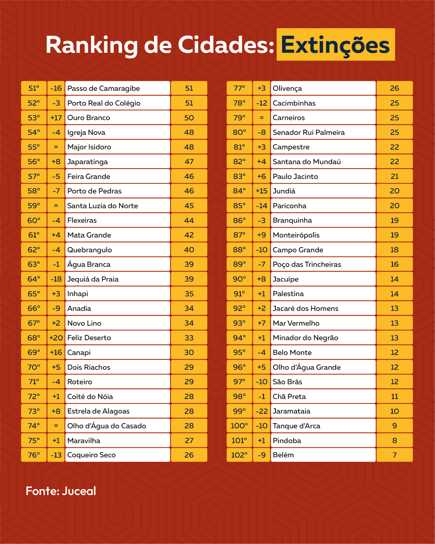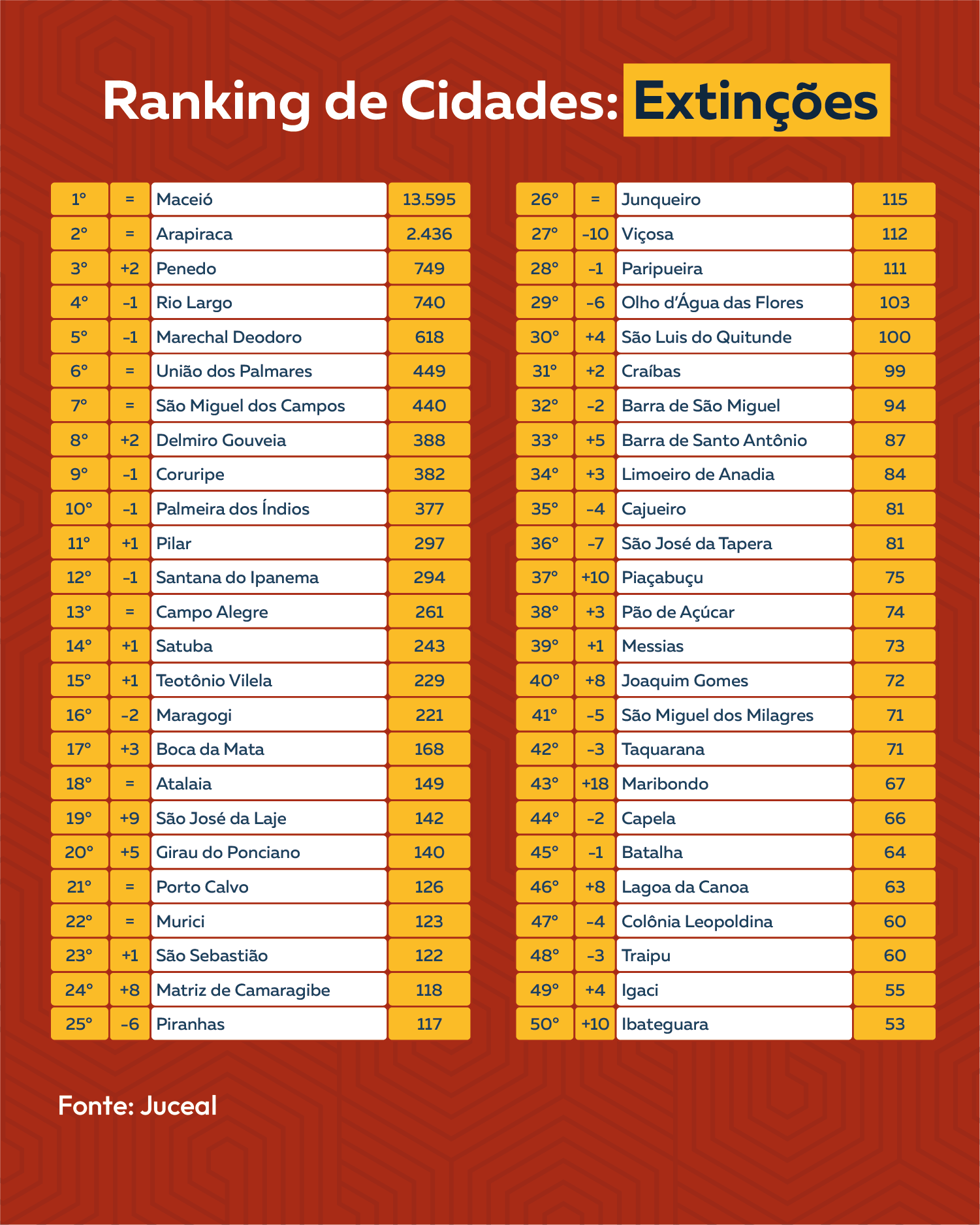 Os municípios que apresentaram os maiores números de extinções foram Maceió (13.595 negócios), Arapiraca (2.436), Penedo (749), Rio Largo (740), Marechal Deodoro (618), União dos Palmares (449), São Miguel dos Campos (440), Delmiro Gouveia (388), Coruripe (382), Palmeira dos Índios (377), Pilar (297), Santana do Ipanema (294), Campo Alegre (261), Satuba (243) e Teotônio Vilela (229).