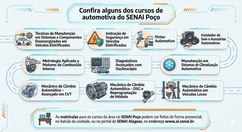 Os cursos integram o portfólio pensado para marcar os 75 anos da unidade, a primeira do Serviço Nacional de Aprendizagem Industrial fundada em Alagoas. Referência na área da automotiva desde o início de suas atividades, ainda na década de 1950, o SENAI Poço promove uma expansão estratégica em sua grade de cursos, com foco em pilares essenciais para a indústria moderna, a exemplo da manutenção automotiva de alta performance. Inéditas no estado, as formações reafirmam o pioneirismo que se tornou uma marca da instituição, e estão voltadas para a manutenção automotiva de alta performance.