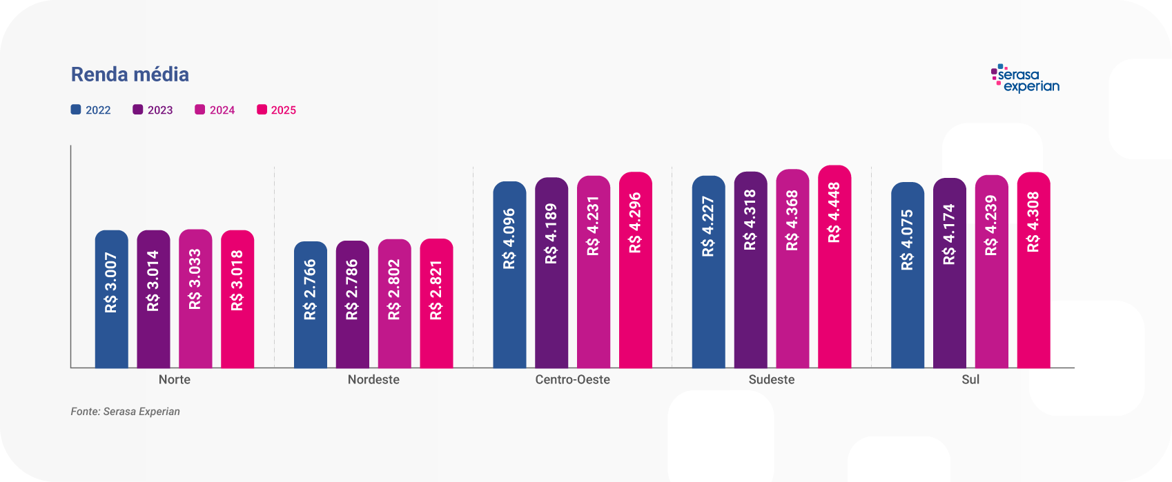 O estudo foi realizado a partir da nova versão, 5.0, das soluções de Renda e Renda+ da Serasa Experian que trazem a estimativa de renda aplicada a uma amostra da população brasileira. Os dados têm como referência novembro de 2025. Os valores de renda média têm referência nominal.