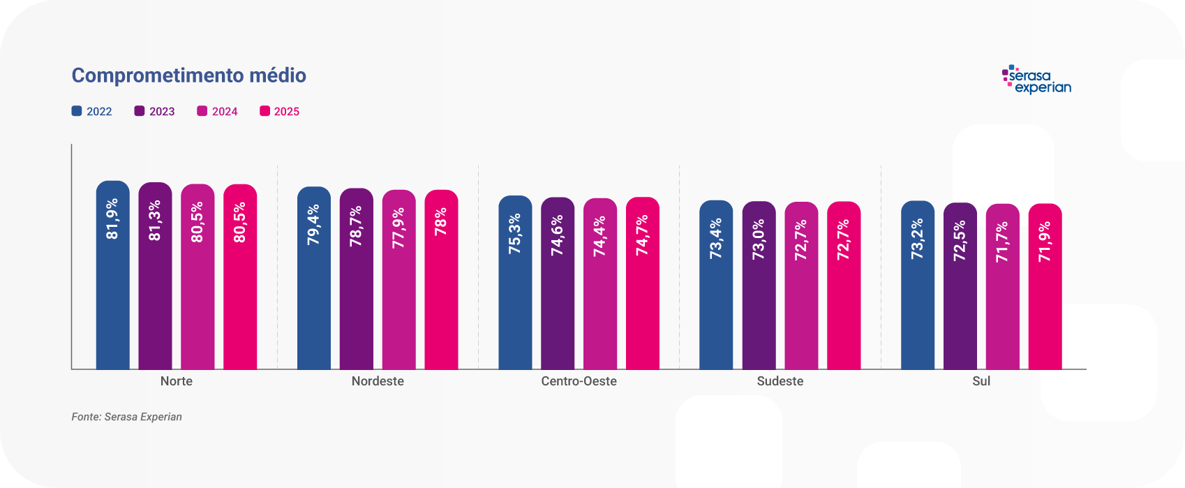 O Nordeste aparece na sequência, com 78% da renda comprometida, seguido pelo Centro-Oeste (74,7%). Já Sudeste (72,7%) e Sul apresentam os menores níveis, indicando maior fôlego relativo no orçamento das famílias dessas regiões.