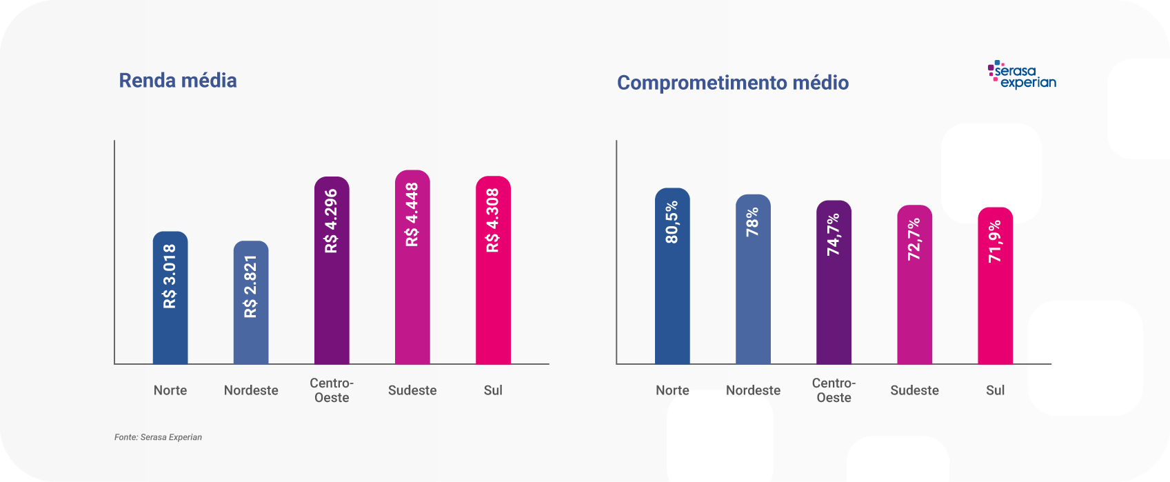 A diferença de renda entre as regiões brasileiras está diretamente associada à pressão sobre o orçamento das famílias. Levantamento da Serasa Experian, primeira e maior datatech do Brasil, mostra que consumidores do Norte comprometem, em média, 80,5% da renda com despesas financeiras, o maior percentual do país. No Sul, onde está o menor índice, o comprometimento é de 71,9%. A distância entre as duas regiões chega a 8,6 pontos percentuais.