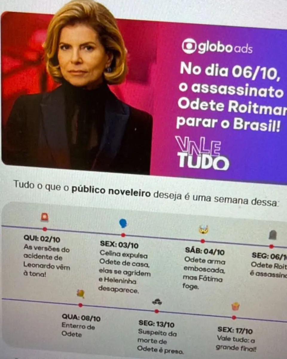 Segundo a divulgação da emissora, os detalhes são "tudo o que o público noveleiro deseja é uma semana dessa". Veja o cronograma dos principais acontecimentos de "Vale Tudo" abaixo: