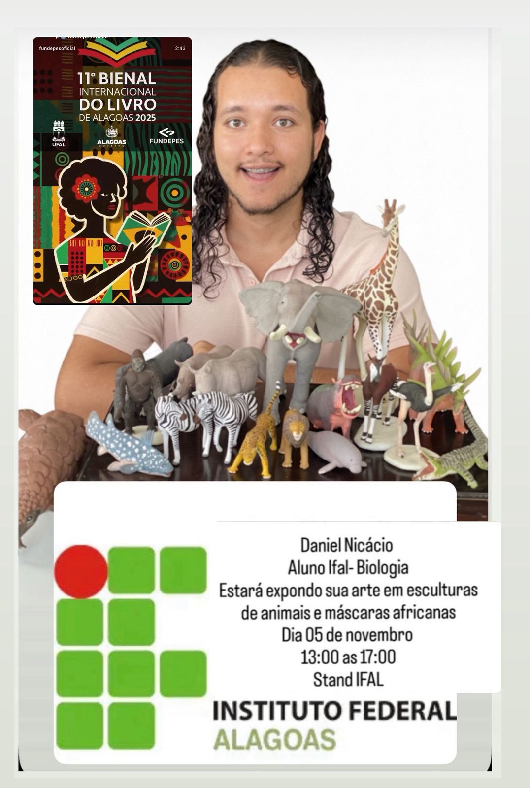 Daniel Nicácio de Araújo Andrade, aluno do Instituto Federal de Alagoas( Ifal) estará fazendo na Bienal do Livro de 2025 uma exposição inclusiva, no próximo dia 05 de Novembro( quarta-feira) de 13:00 às 17:00.