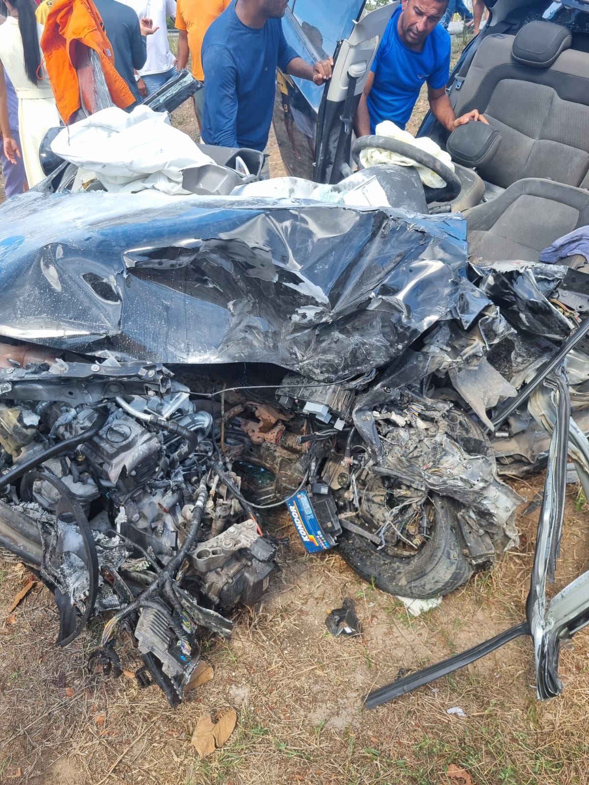 Imagens encaminhadas ao Jornal de Alagoas mostram a frente do veículo de passeio completamente destruída. No local, também é possível ver equipamentos e ferramentas espalhados pela pista, o que indica a força da colisão.